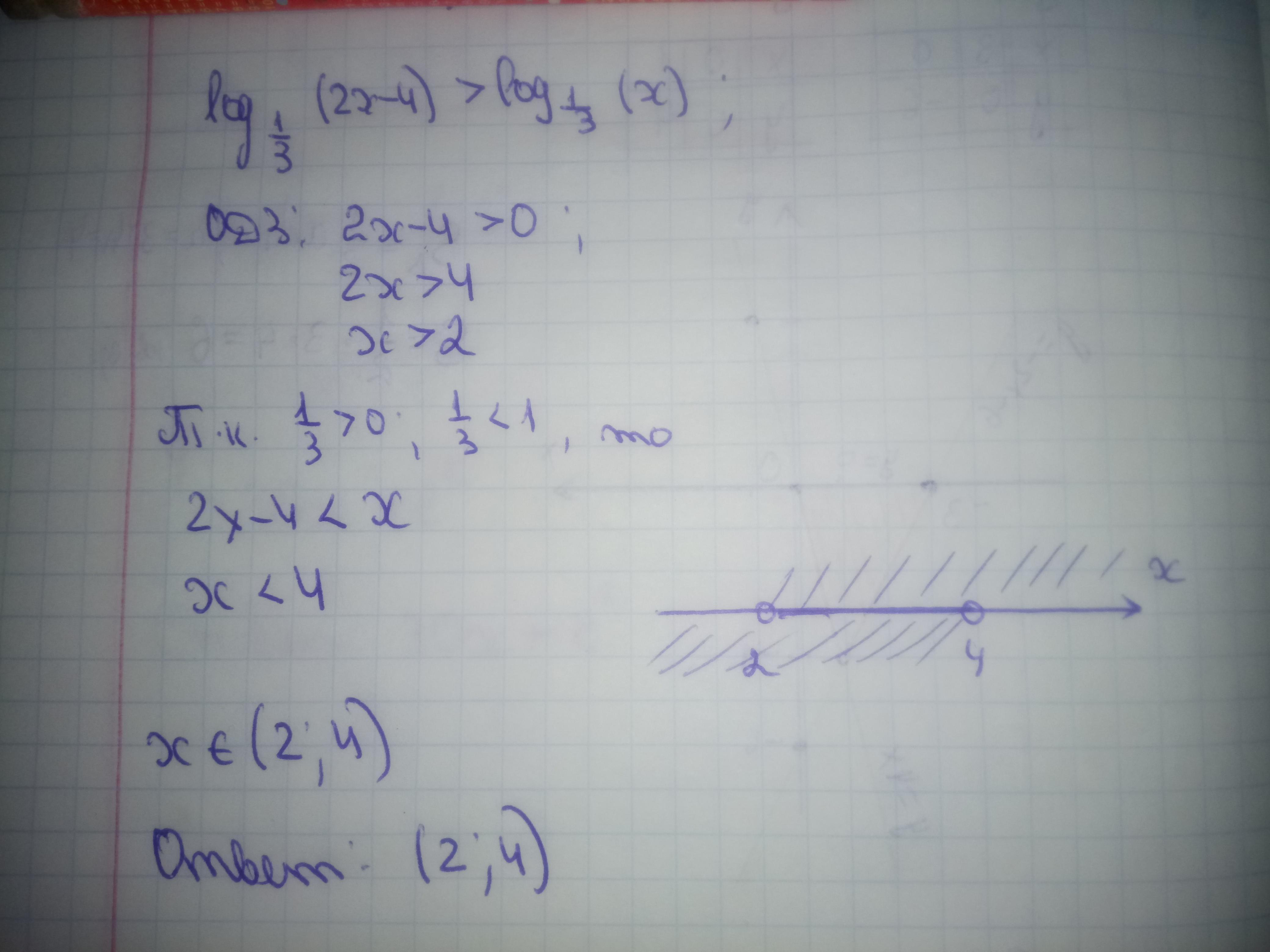 Решите неравенство: log1 (2x-4) > log1 (x)