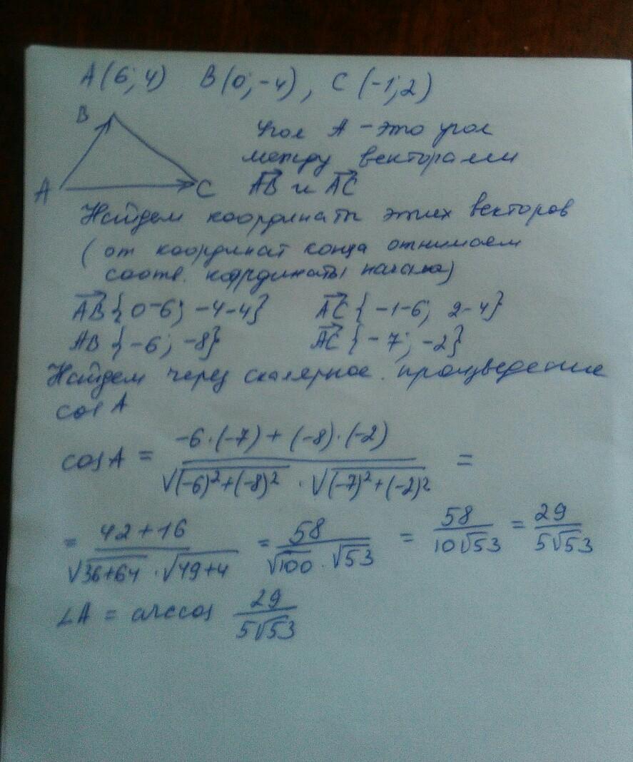 Найдите угол А треугольника ABC,если известны координаты вершинA(6;4),B(0;-4),C(-1;2)помогите пж