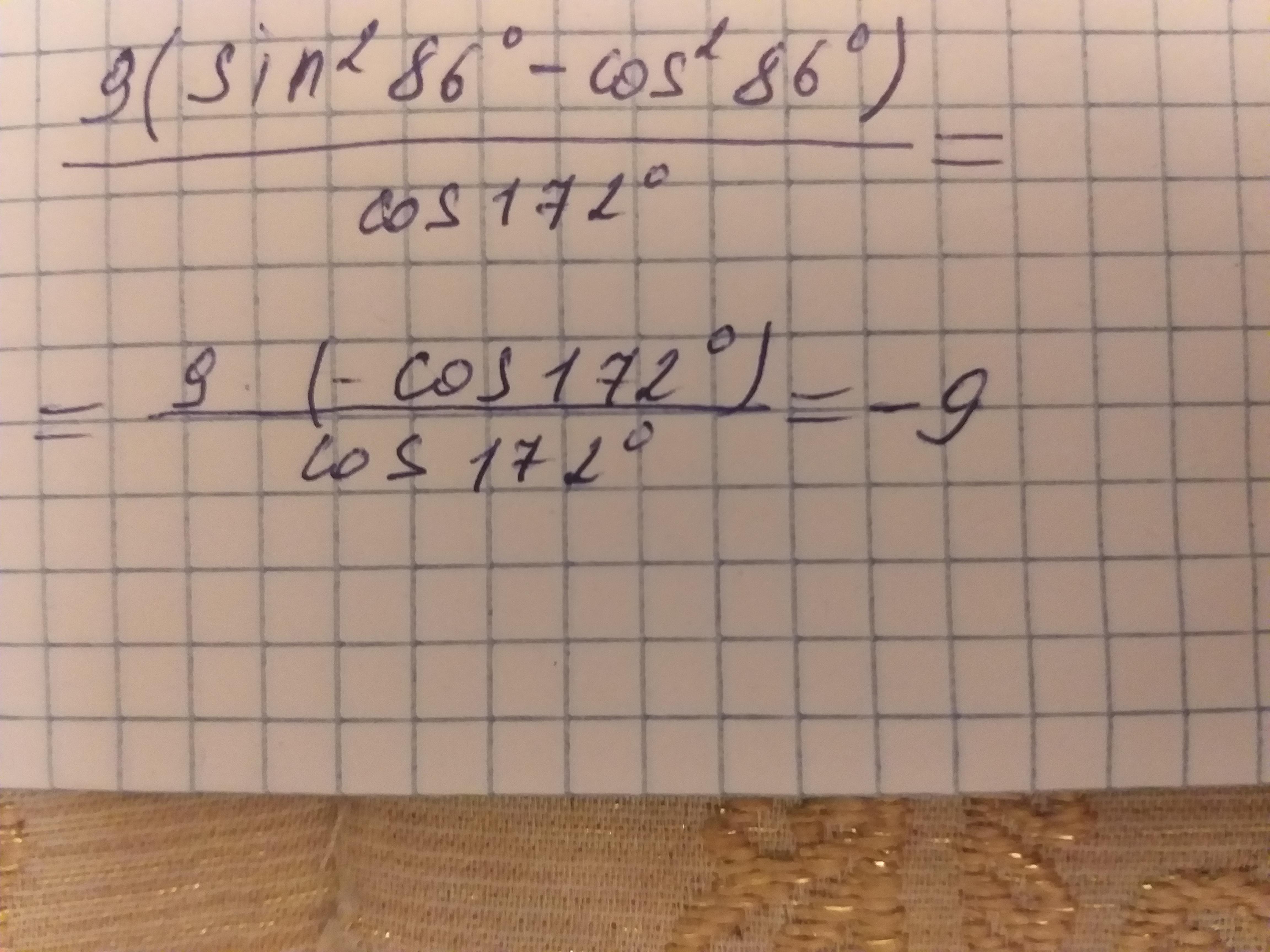 Пошаговое объяснение:В числителе по формуле косинуса двойного угла (-cos(172). Значит ответ (-9)