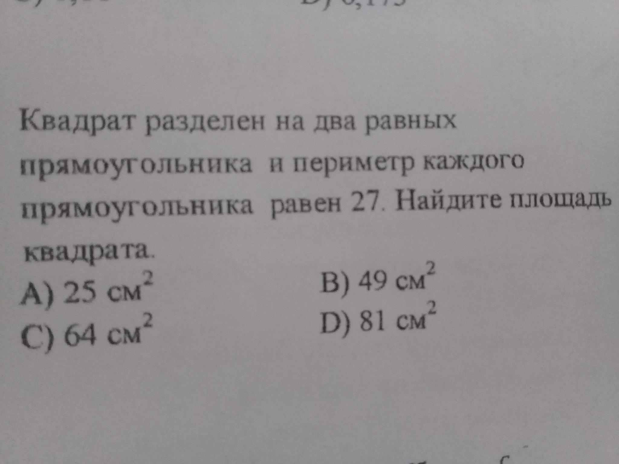 Квадрат разделен на два равных прямоугольника и периметр каждого прямоугольника равен 27. Найдите площадь квадрата.