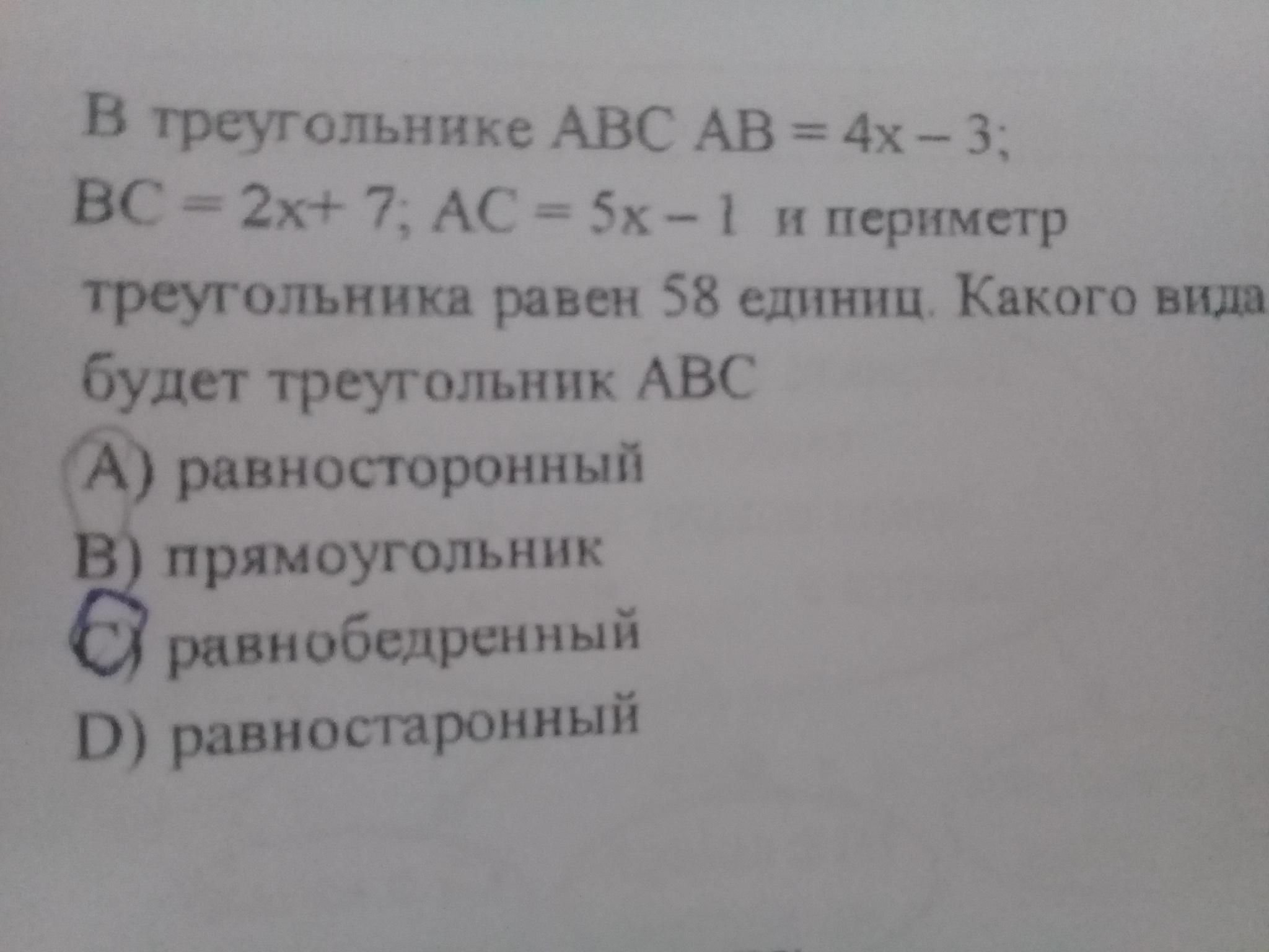 В треугольнике АВС АВ=4х-3; ВС=2х+7; АС=5х-1 и периметр треугольника равен 58 единиц. Какого вида будет треугольник АВС