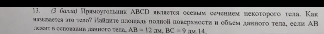 По задаче можно определить, что АВ - это диаметр, равный 12 дм, следовательно, радиус (r) равен 12 : 2 = 6 дм. ВС - это высота (h) в 9 дм.
