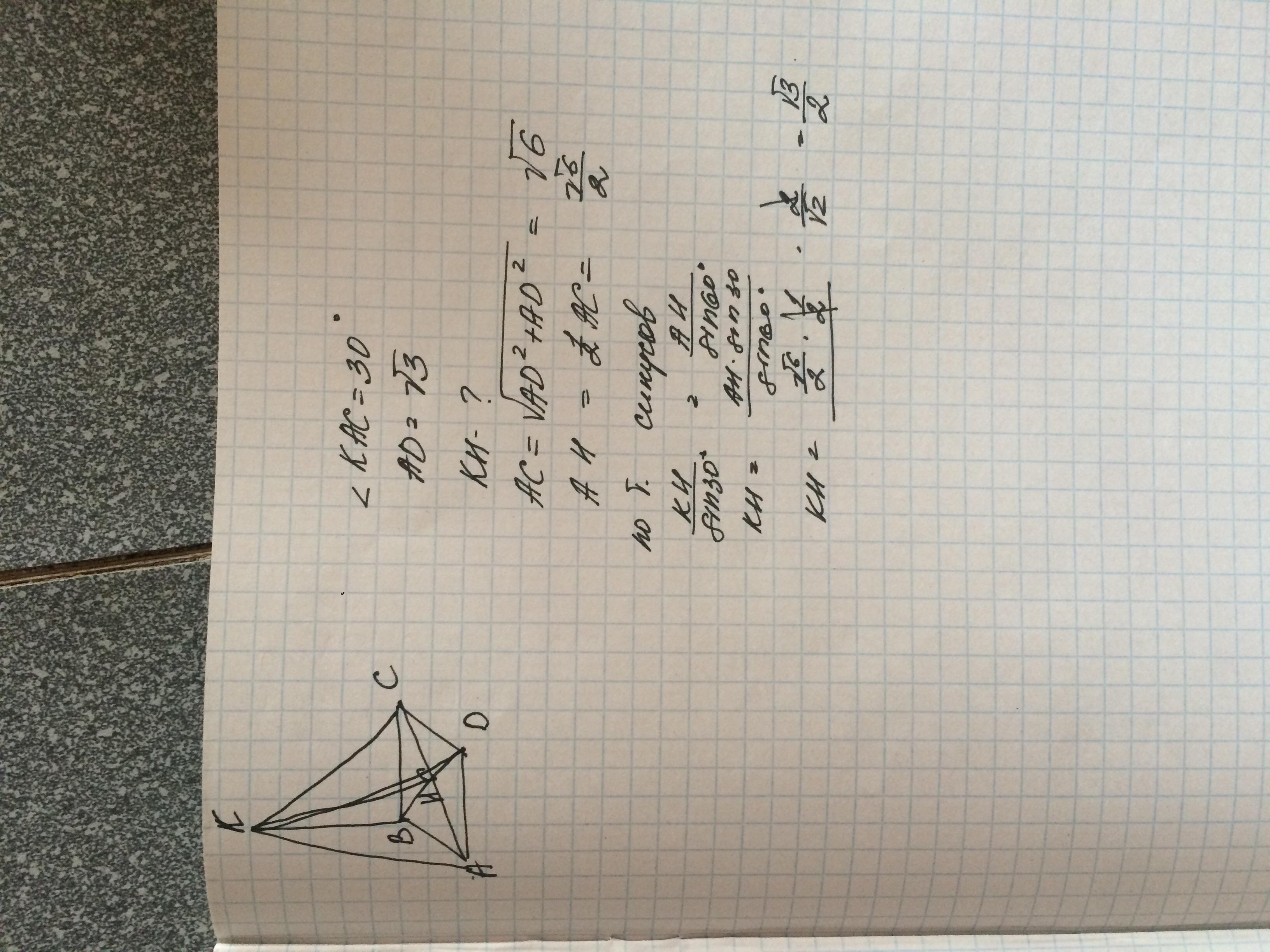Боковые ребра правильной четырехугольной пирамиды наклонены к основанию под углом 30°, а сторона основания равна (sqrt{3}). Найдите высоту пирамиды.