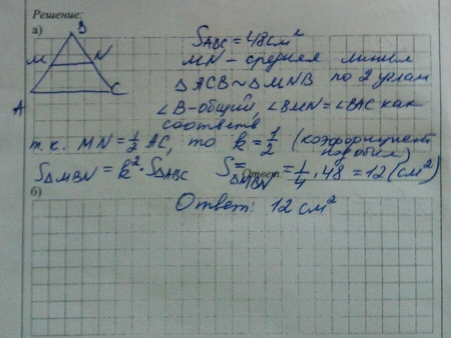 У трикутнику, площа якого дорівнює 48 см2, проведено середню лінію. Знайдіть площу трикутника, який утворився.