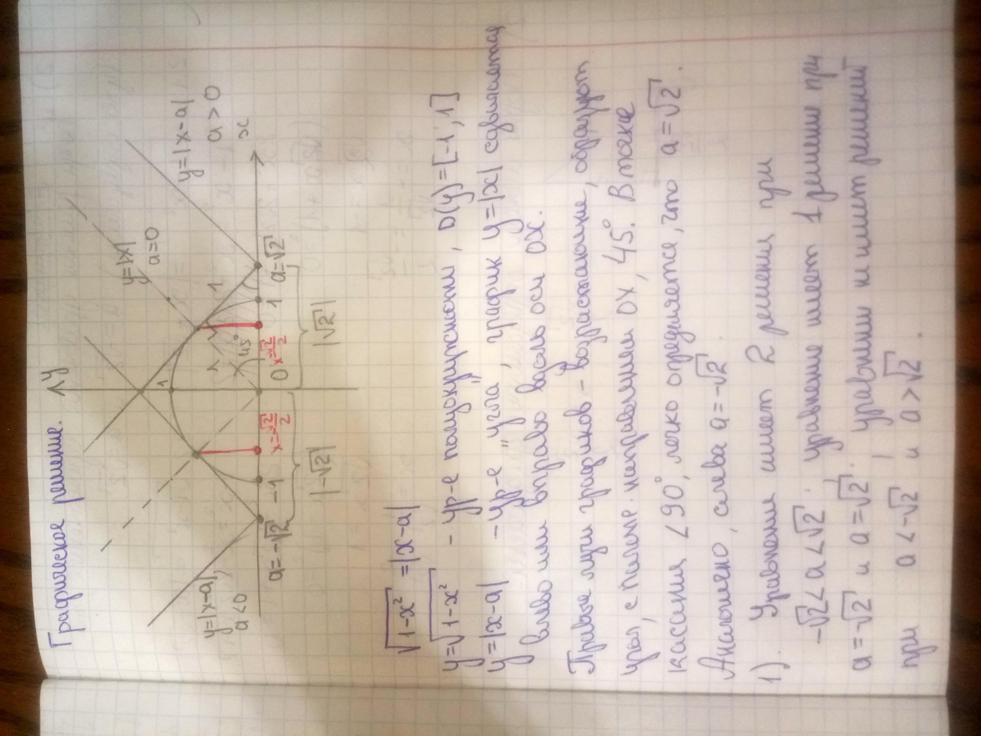 Эту задачу можно решать геометрически: левая часть уравнения задает верхнюю половину окружности, справа стоит "галка" модуля. Меняя значение параметра a, двигаем галку. Наша задача - добиться касания галки и полуокружности.