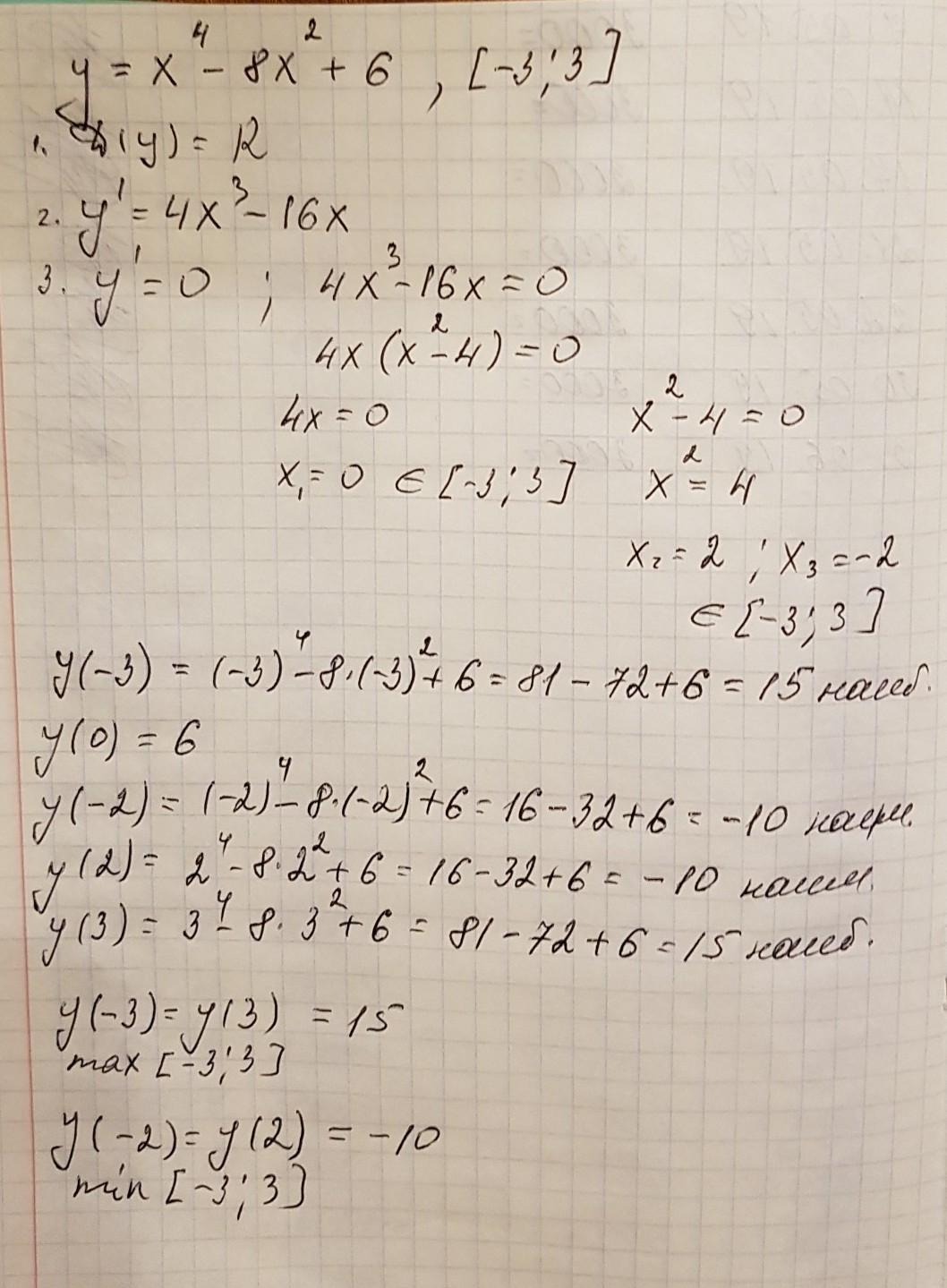 найти наибольшее и наименьшее значение функции y=x⁴-8x²+6 на отрезке [-3;3]