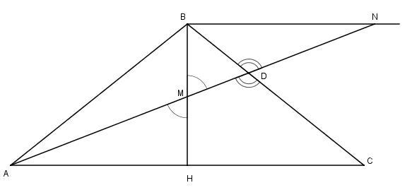 Пусть М — точка пересечения прямой AD и высоты BH. Через точку В проведём прямую, параллельную АС, и продолжим, AD до пересечения с это прямой в точке N. Пусть AH = CH = x, тогда AC = 2x.