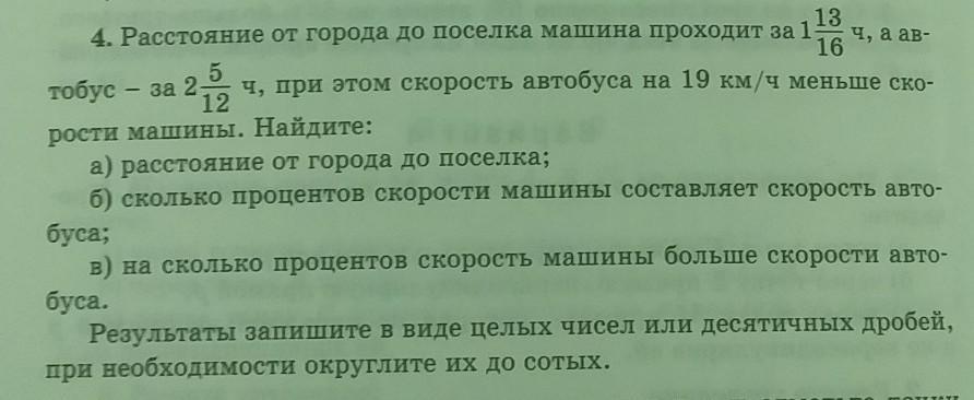 Принимаем скорость машины за х ,тогда расстояние -1 13/16 х.Скорость автобуса х-19,расстояние -2 5/12(х-19).