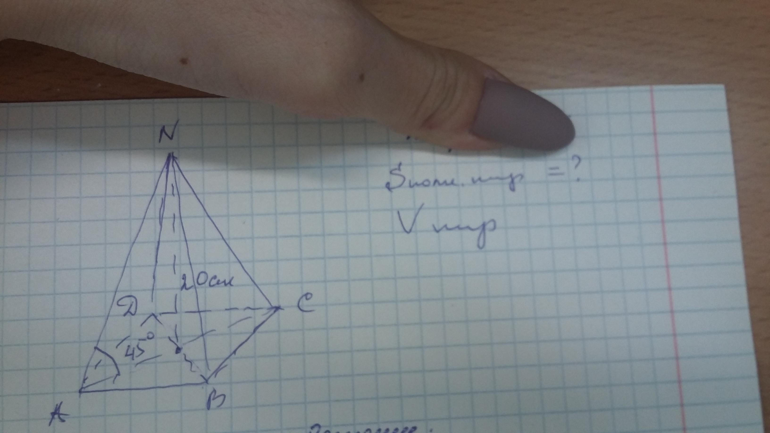 Дана правильная прямоугольная пирамида: высота равна 20 см угол NAC равен 45 градусов. Найти S полной пирамиды, V пирамиды.
