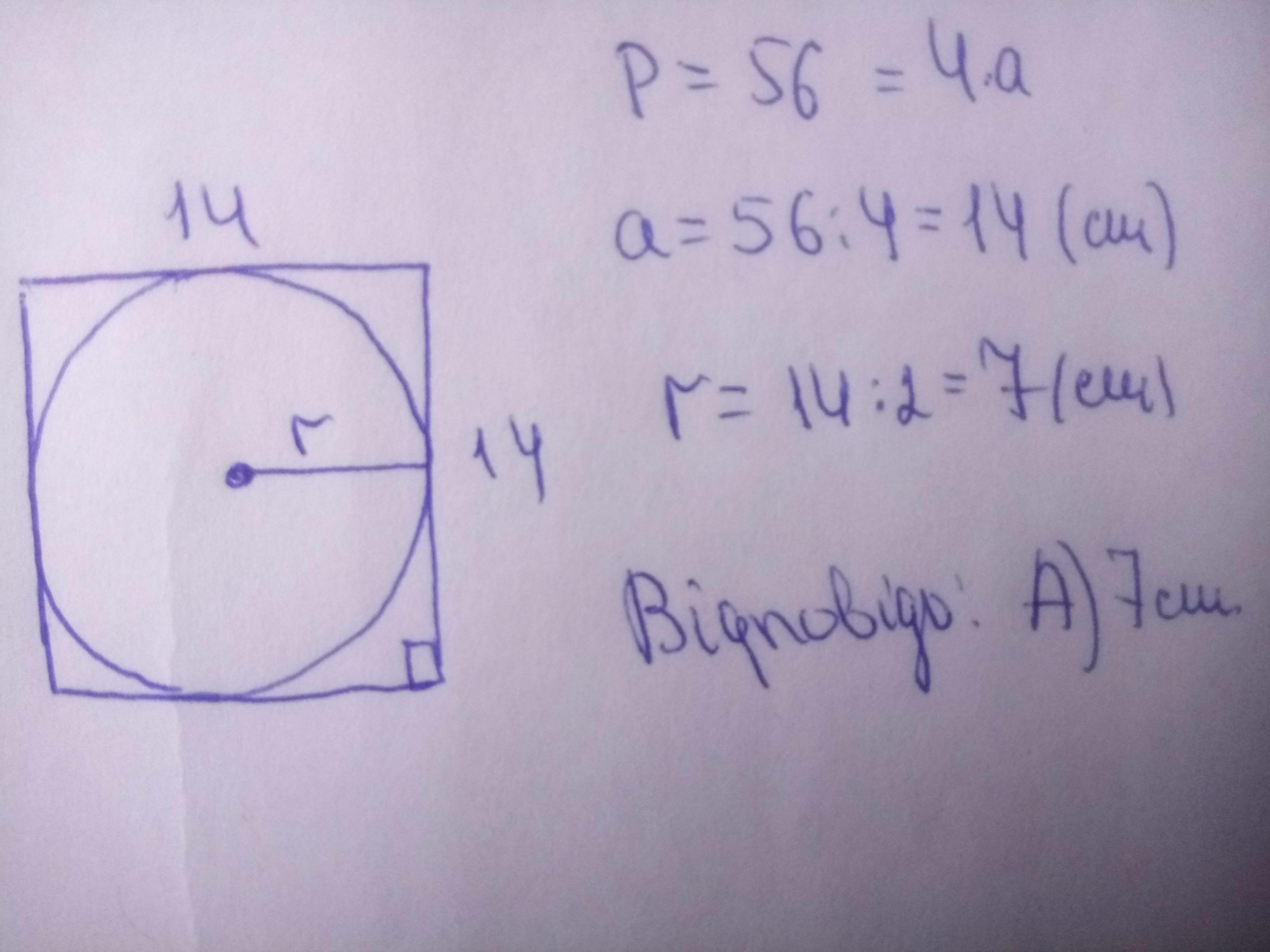 Периметр правильного чотирикутника дорівнює 56 см. Обчислити радіус кола, вписаного в цей чотирикутник.