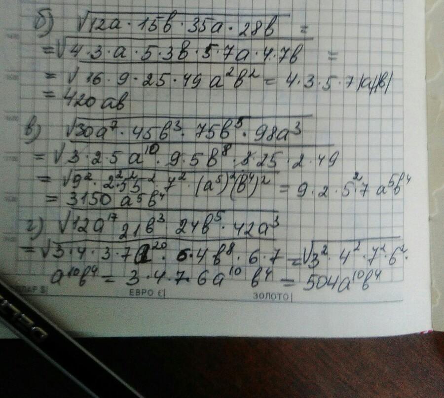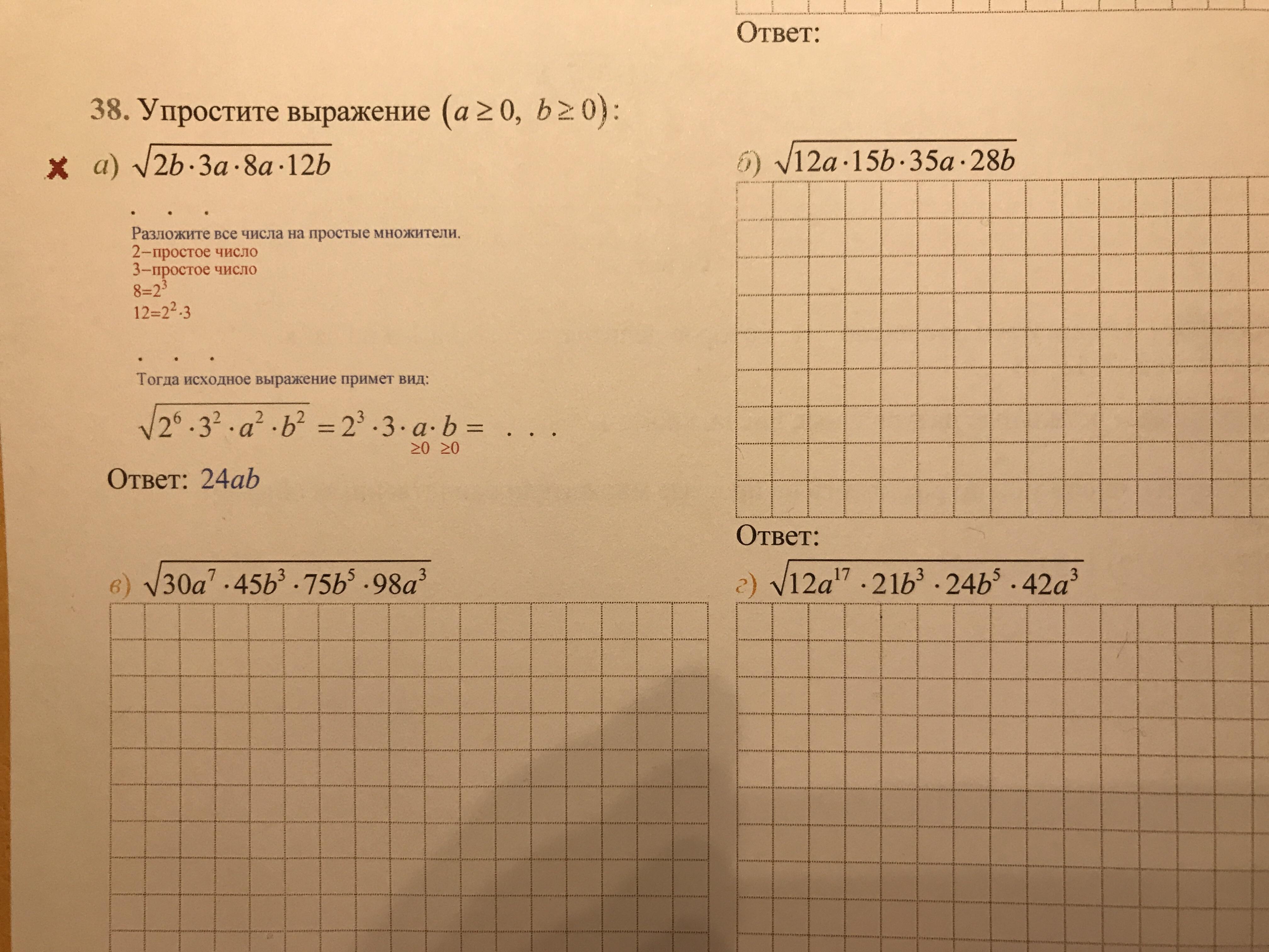 Вы не выполнили задание. Обратите внимание на то, что в образце предложено отработать разложение чисел на простые множители. Лишь потом используют св- во извлечения корня из степени. Подправьте, пожалуйста, ответ.