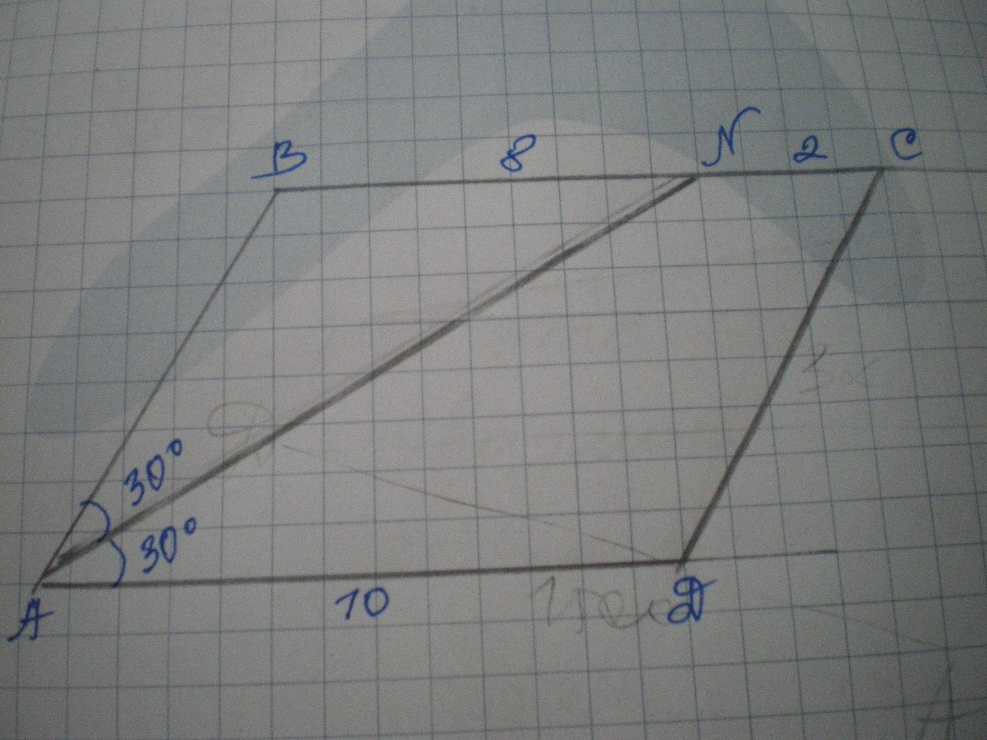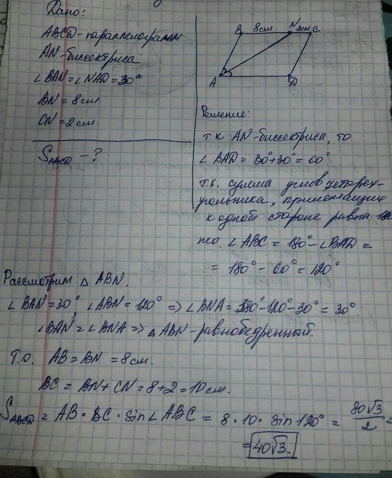 Биссектриса AN параллелограмма ABCD разбивает этот угол A на два угла по 30 градусов каждый, а противоположную сторону разбивает на отрезки BN = 8 см и CN = 2 см. Найдите площадь параллелограмма.