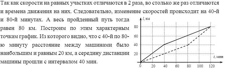 На полпути. Из пункта А в пункт Б по прямой дороге выезжают два автомобиля. Первый половину всего пути едет со скоростью 60 км/ч, а вторую половину пути со скоростью 30 км/ч. Второй автомобиль наоборот, первую половину пути едет со скоростью 30 км/ч, а вторую половину пути со скоростью 60 км/ч. В результате в пункт Б они приезжают одновременно через 120 мин после старта. На одних координатных осях постройте графики зависимостей расстояний, пройденных автомобилями от времени их движения и определите, с каким временным интервалом они проехали середину дистанции, и какое максимальное расстояние было между ними во время движения.