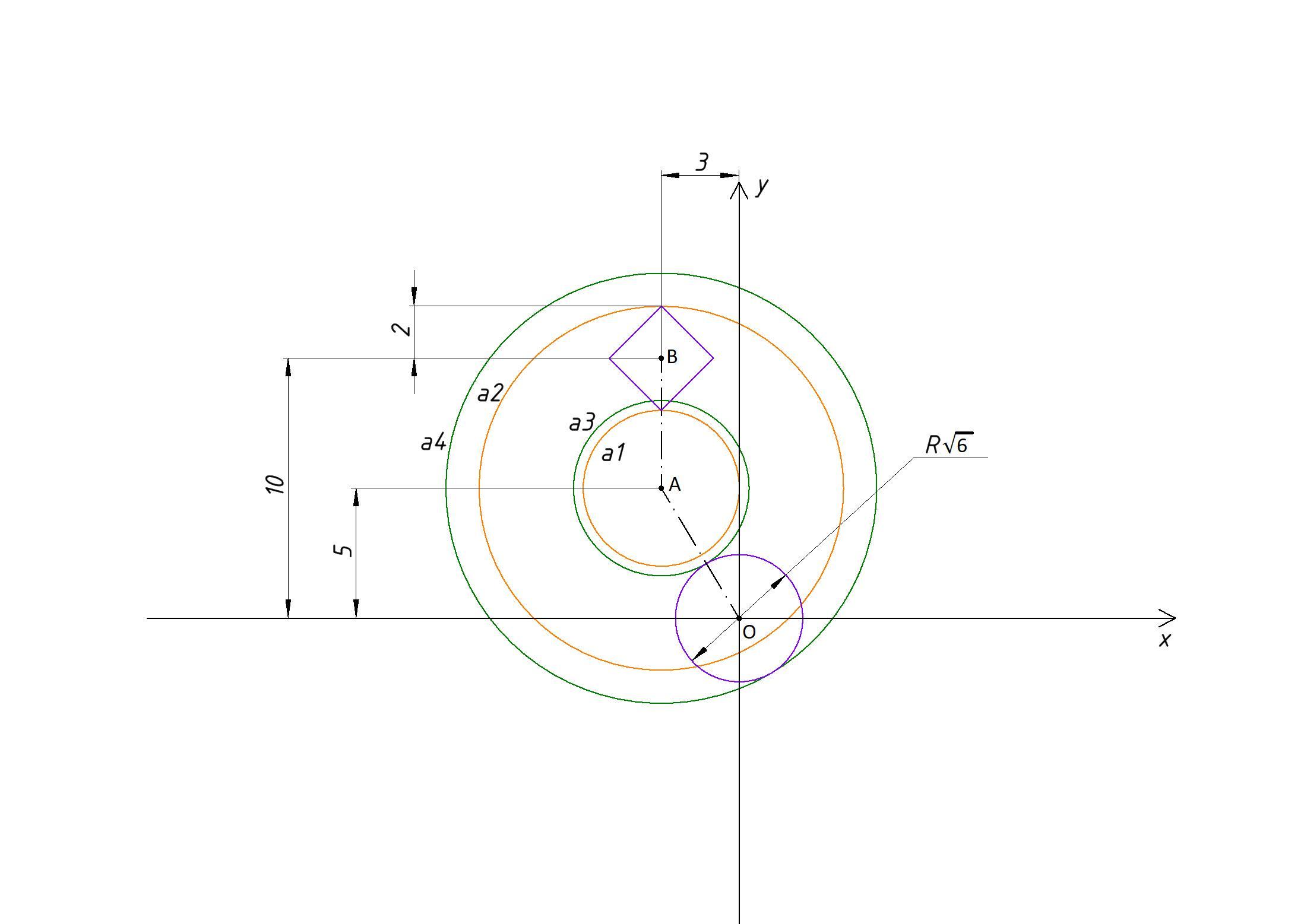 На рисунке показаны случаи касания окружности из уравнения к окружности и к квадрату из уравнения 1.