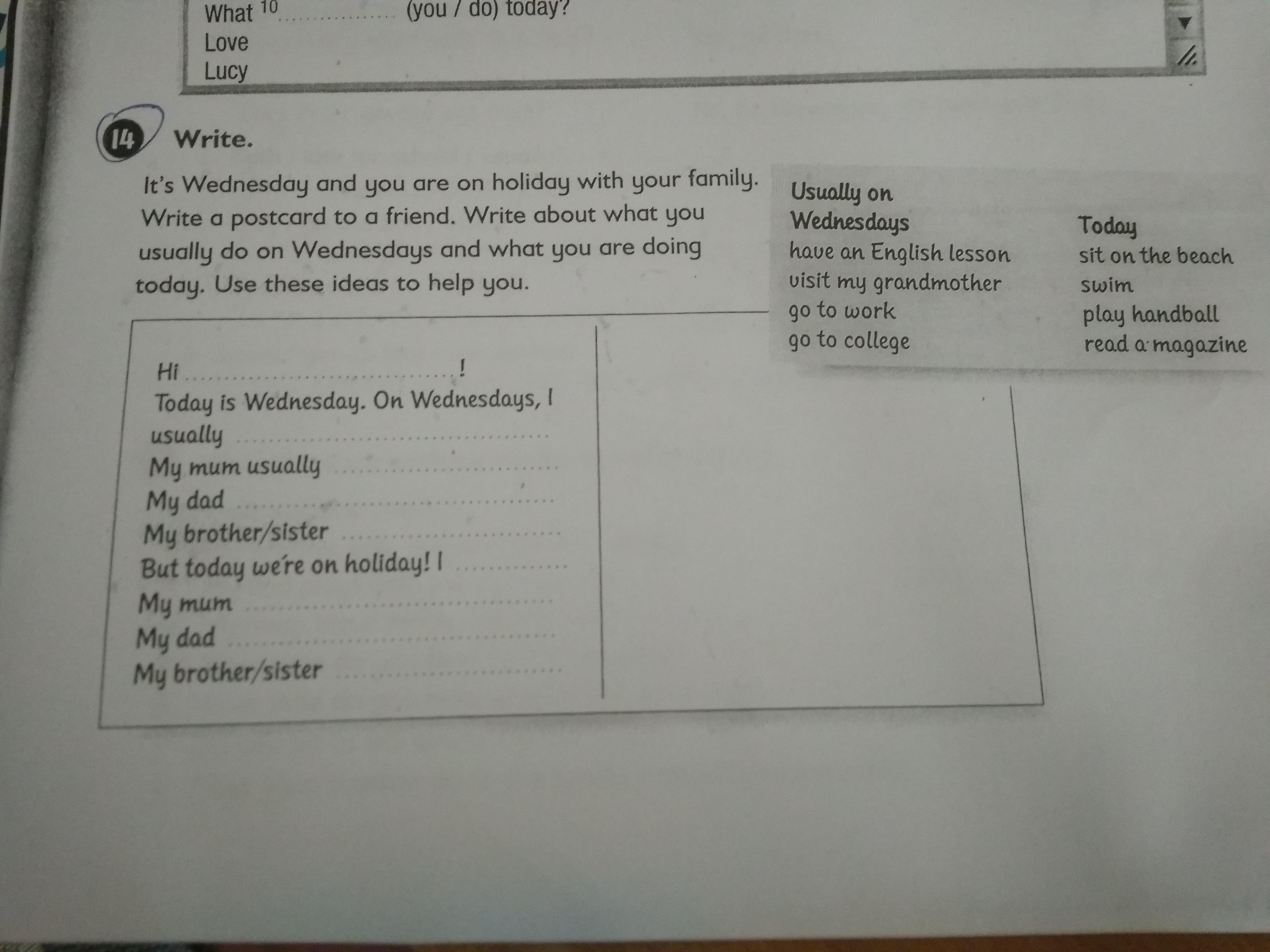 Привет, Мери! Сегодня среда. Обычно по средам у меня урок английского. Мама обычно навещает бабушку. Мой отец ходит на работу. Мой брат учится в колледже. Но сегодня мы в отпуске! (сейчас) Я сижу на пляже. Моя мама читает журнал. Мой папа плавает. Мой брат играет в гандбол.