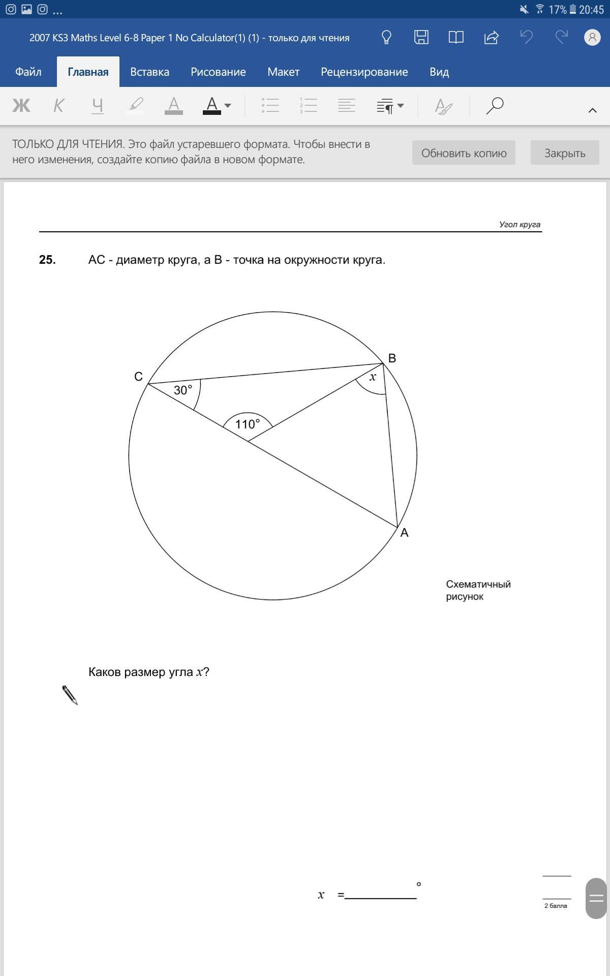 Теперь вспомним еще одно правило: если у нас есть вписанный угол, лежащий на окружности, то его дуга в градусах равна двум данным углам. Угол CBA опирается на дугу в 180° (так как CA - это диаметр), значит, он равен 180°/2 = 90°.То есть угол CBA - прямой.