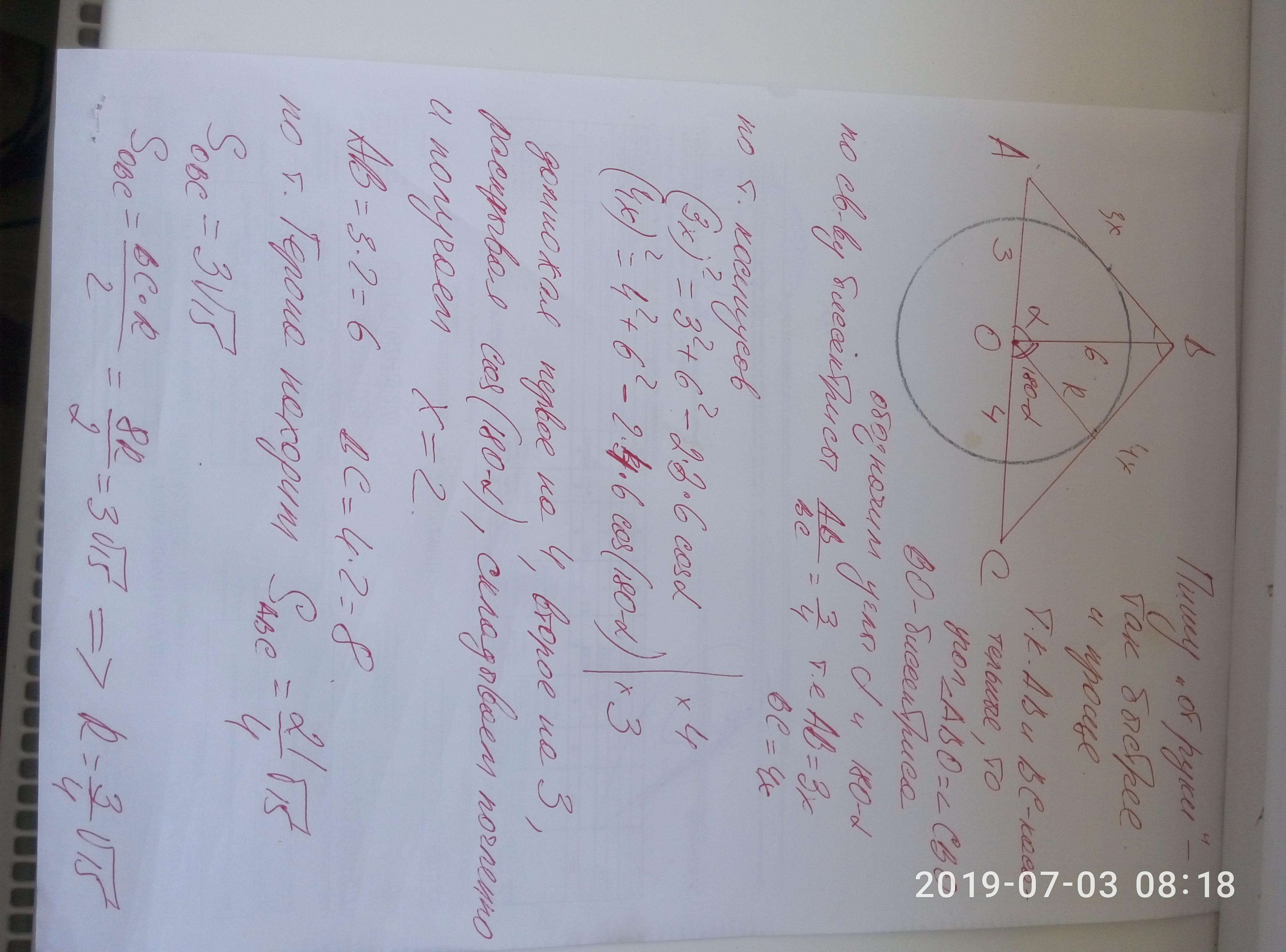 Все так ,решение хорошее , только переход от площади треугольника АВС к площади треугольника ОВС можно было объяснить , вы на 4/ 7 умножили , но если вопросов у LIkk2003 нет , значит все понятно и еще можно без теоремы косинусов обойтись , если использовать формулу биссектрисы треугольника : BO^2 = AB*BC - AO*OC или 36 = 12х^2 -12
