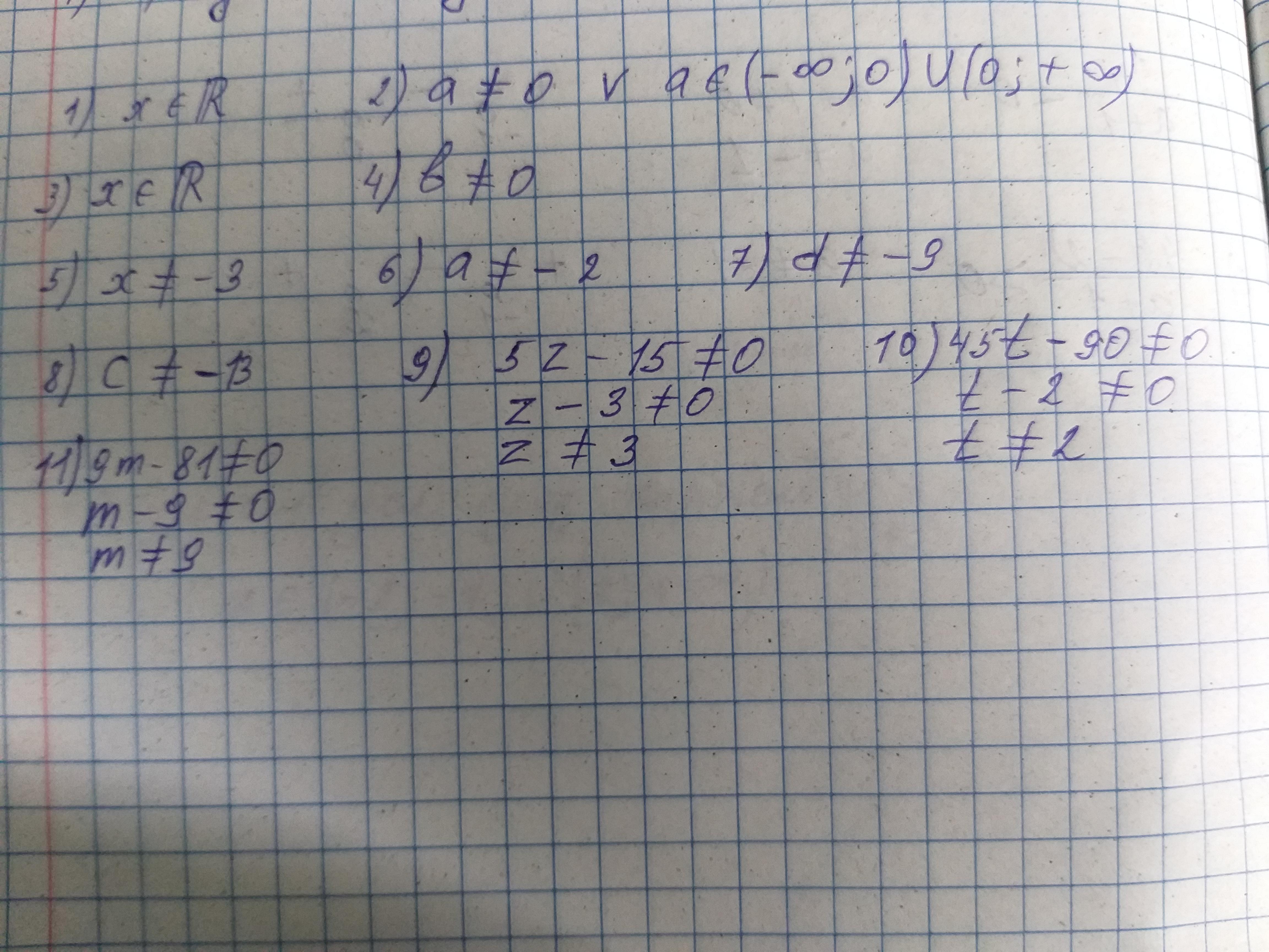 1)любое 2) кроме 0 3) любое 4) кроме 0 5) кроме -3 6) кроме -2 7) кроме -9 8) кроме -13 9) кроме 3 10) кроме 2 11)кроме 9.
