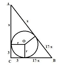 Пусть прямоугольный треугольник АВС. Угол С=90°. Точка касания делит гипотенузу на отрезки: х и 17-х. Отрезки катетов от вершин А и В до точек касания равны х и 17-х, как касательные, проведенные из одной точки. Отрезки катетов от вершины С до точек касания равны радиусу вписанной окружности, то есть равны 3. Тогда катеты равны х+3 и 17-х+3 = 20-х. По Пифагору: