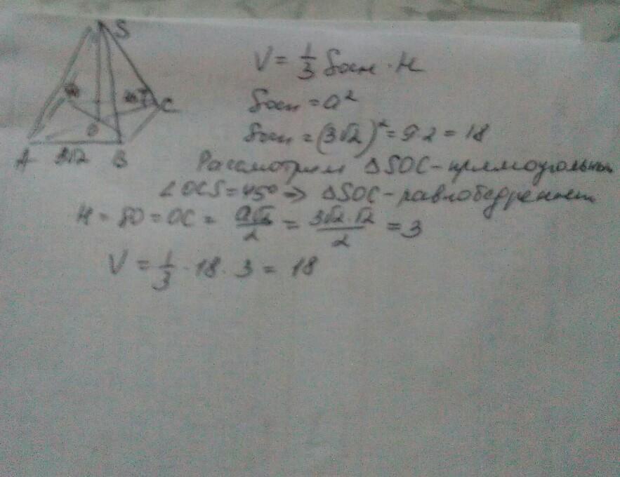 В правильной четырёхугольной пирамиде сторона основания равна 3√2, а боковое ребро наклонено к плоскости снования под углом в 45 градусов. Найдите объём пирамиды.