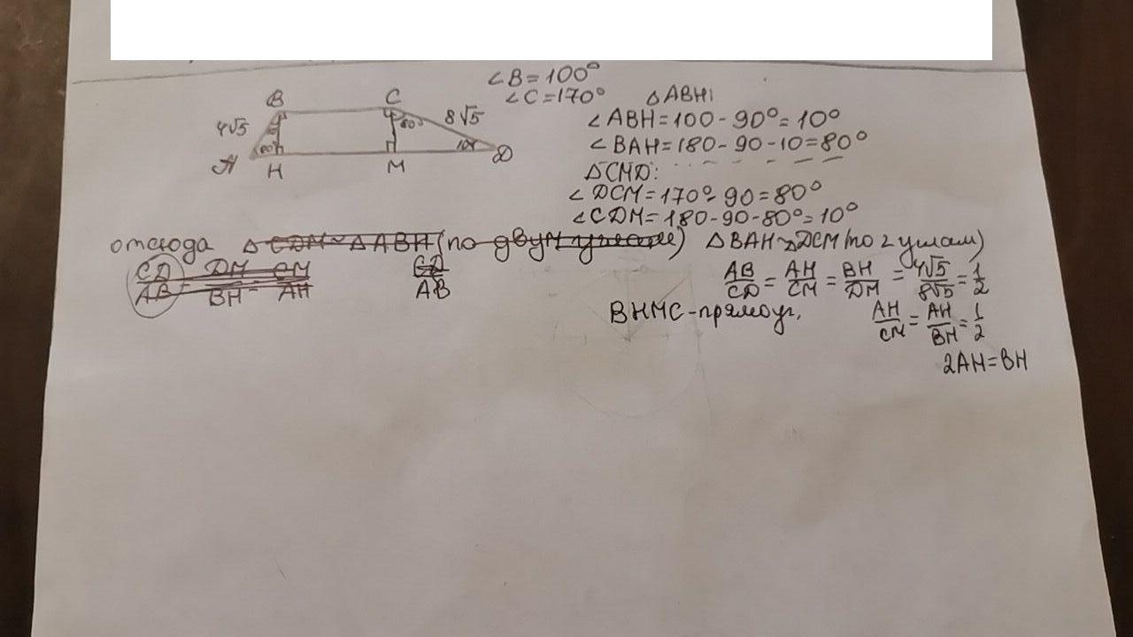 дана трапеция,углы при меньшем основании равны 100° и 170°, боковые стороны равны 4√5 и 8√5. Найдите высоту трапеции и разность оснований.
