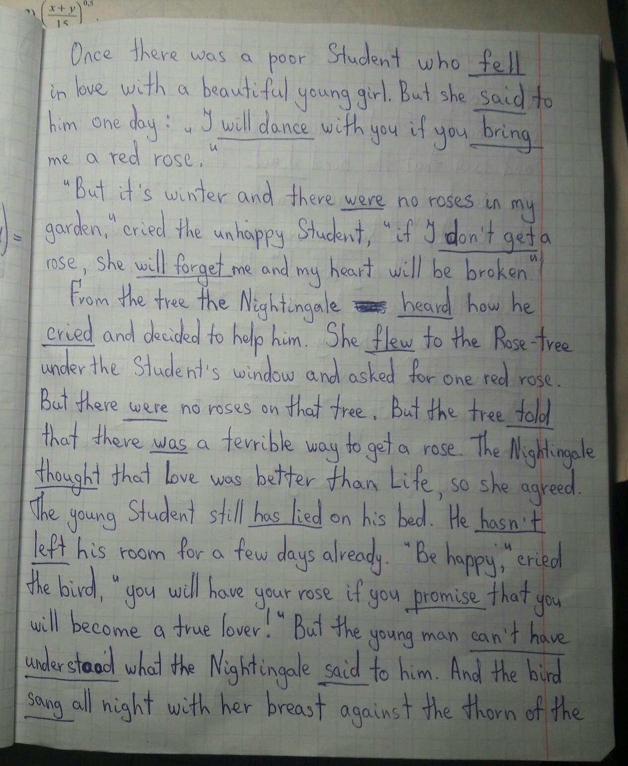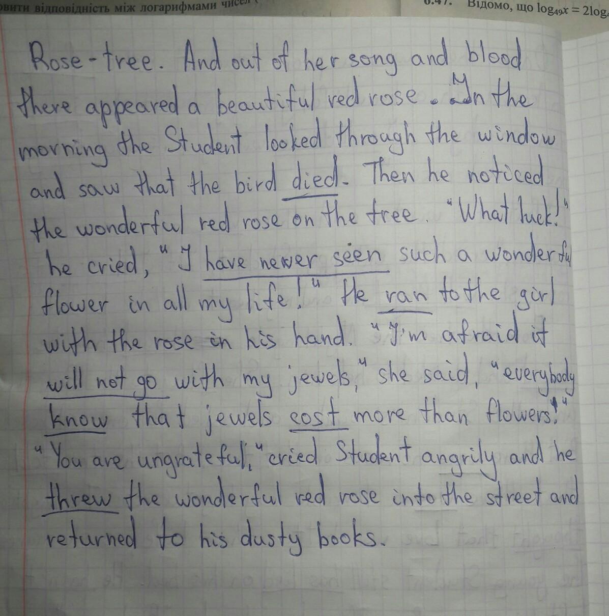 From the tree the Nightingale (hear) how he (cry) and decided to help him. She (fly) to the Rose-tree under the Student's window and asked for one red rose. But there (be) no roses on that tree. But the tree (tell) her that there (be) a terrible way to get a red rose. The Nightingale (think) that Love was better than Life, so she agreed. The young Student still (lie) on his bed. He (not / leave) his room for a few days already. " Be happy ," cried the bird, " you will have your rose if you (promise) that you (become) a true lover! " But the young man (can / not / understand) what the Nightingale (say) to him. And the bird (sing) all night with her breast against the thorn of the Rose-tree. And out of her song and blood there appeared a beautiful red rose. In the morning the Student looked through the window and saw that the bird (die). Then he noticed the wonderful red rose on the tree. " What luck! " he cried, " I (never / see) such a wonderful flower in all my life! " He (run) to the girl with the rose in his hand. " I'm afraid it (not / go) with my jewels," she said, " everybody (know) that jewels (cost) more than flowers! " " You are ungrateful," cried the Student angrily and he (throw) the wonderful red rose into the street and returned to his dusty books.