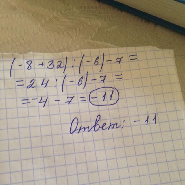 (-8+32)/(-6)-7 = 24/(-6)-7 = -4-7 = -11