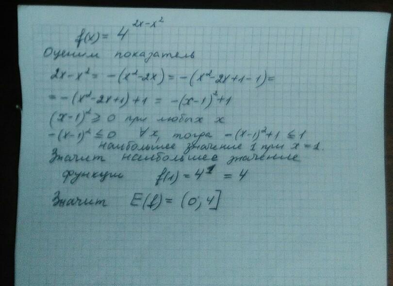 Помогите пожалуйста нужно определить множество значений функции f(x)=4 в степени 2x-x^2 ,если можно с решением