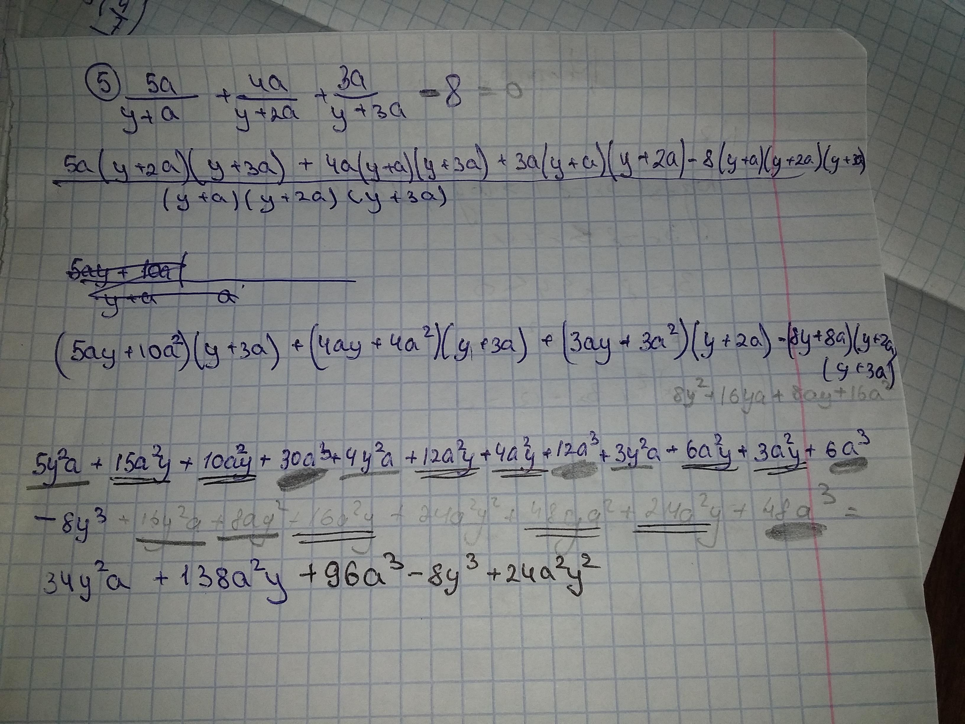 понизить степень (чтобы не решать кубическое уравнение) помогло выделение целой части: 5а/(y+a) = (5a+5y-5y)/(y+a) = 5(y+a)/(y+a) - 5y/(y+a) = 5 - 5y/(y+a) это для первой дроби...