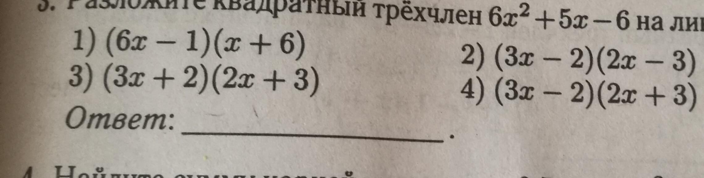 разложите квадратный трехчлен 6x^2-5x-6 на линейные множители