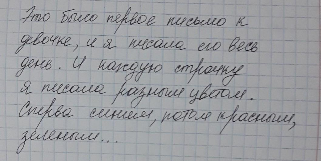 Это было первое письмо к девочке, и я писала его весь день. И каждую строчку я писала разным цветом. Сперва синим, потом красным, зелёным…