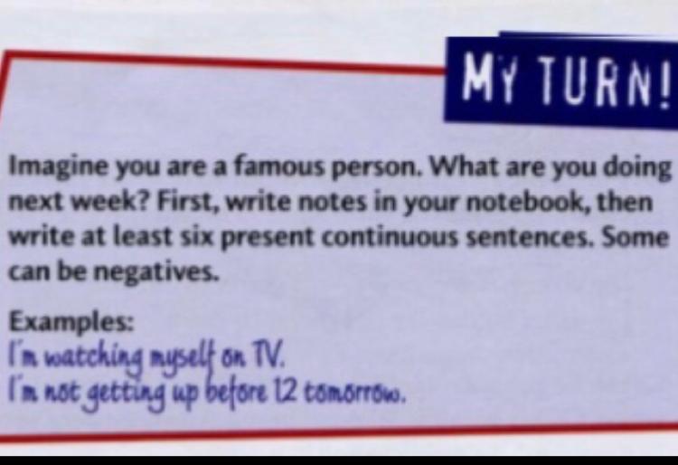 I'm meeting my best friend Andrea at the airport. I'm meeting with the Queen in England.I'm having a rest with Andrea after the meeting in my room in/at а five-star hotel.