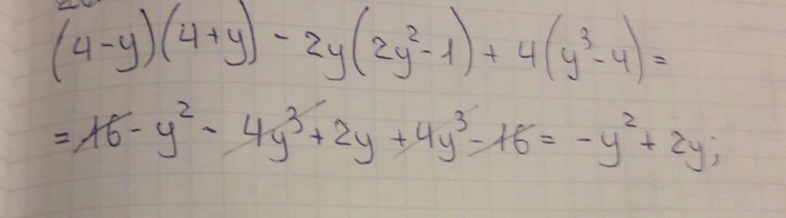 Упростите выражение (4-у)(4+у)-2у(2у²-1)/+4(у³-4) Подробное решение. Срочно !!!!!!!!!!!!!