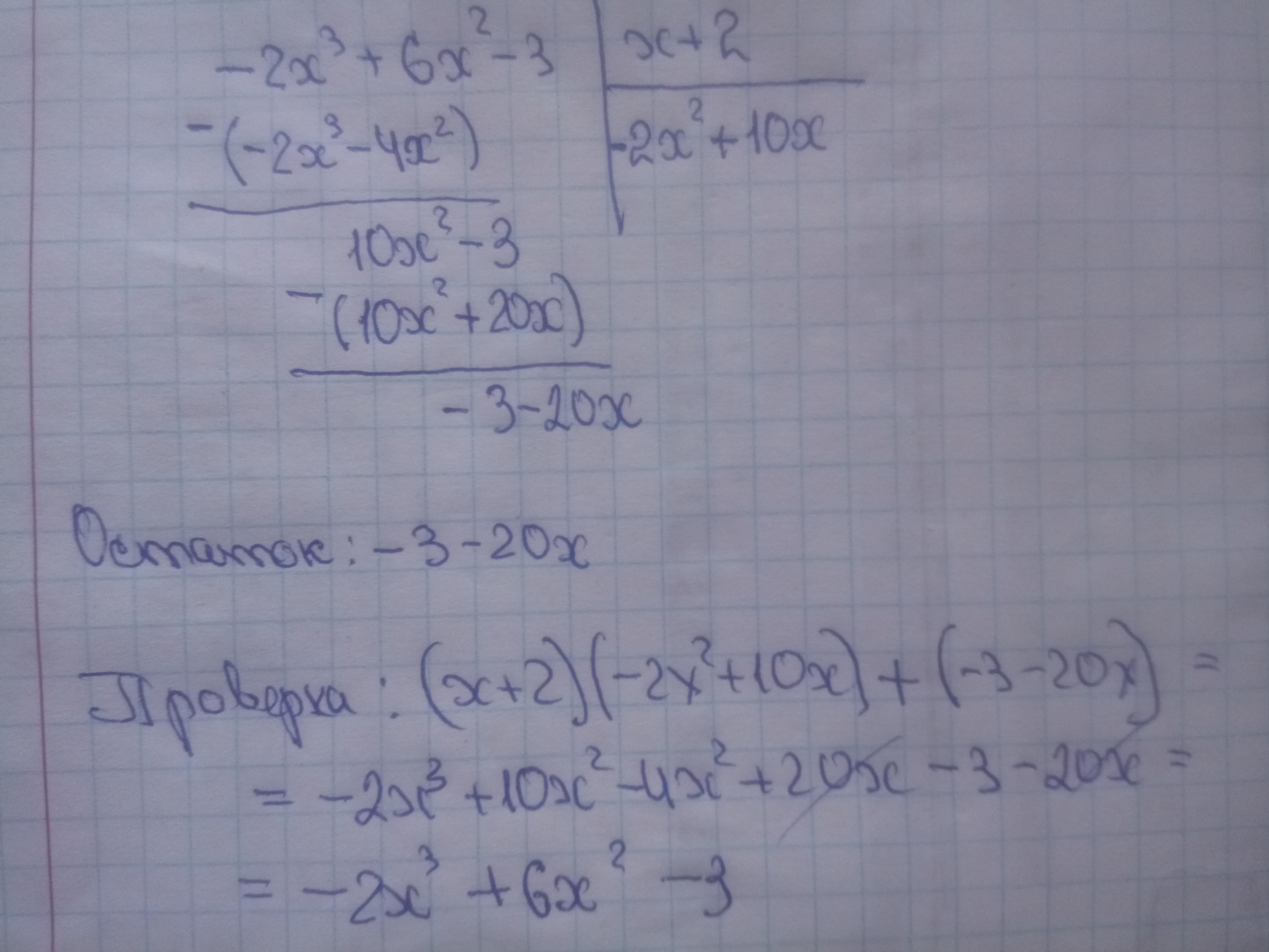 Можно воспользоваться Теоремой Безу: остаток от деления многочлена -2х³+6х²-3 на двучлен х+2 равен значению этого многочлена при х=-2, т.е. -2·(-2)³+6·(-2)²-3 = 16+24-3 = 37.