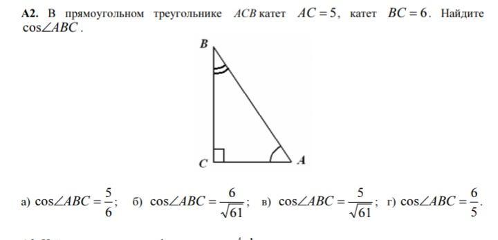 В прямоугольном треугольнике АСВ катки АА=5,катет ВС=6. Найдите cos угла АВС. Прошу развернутый ответ