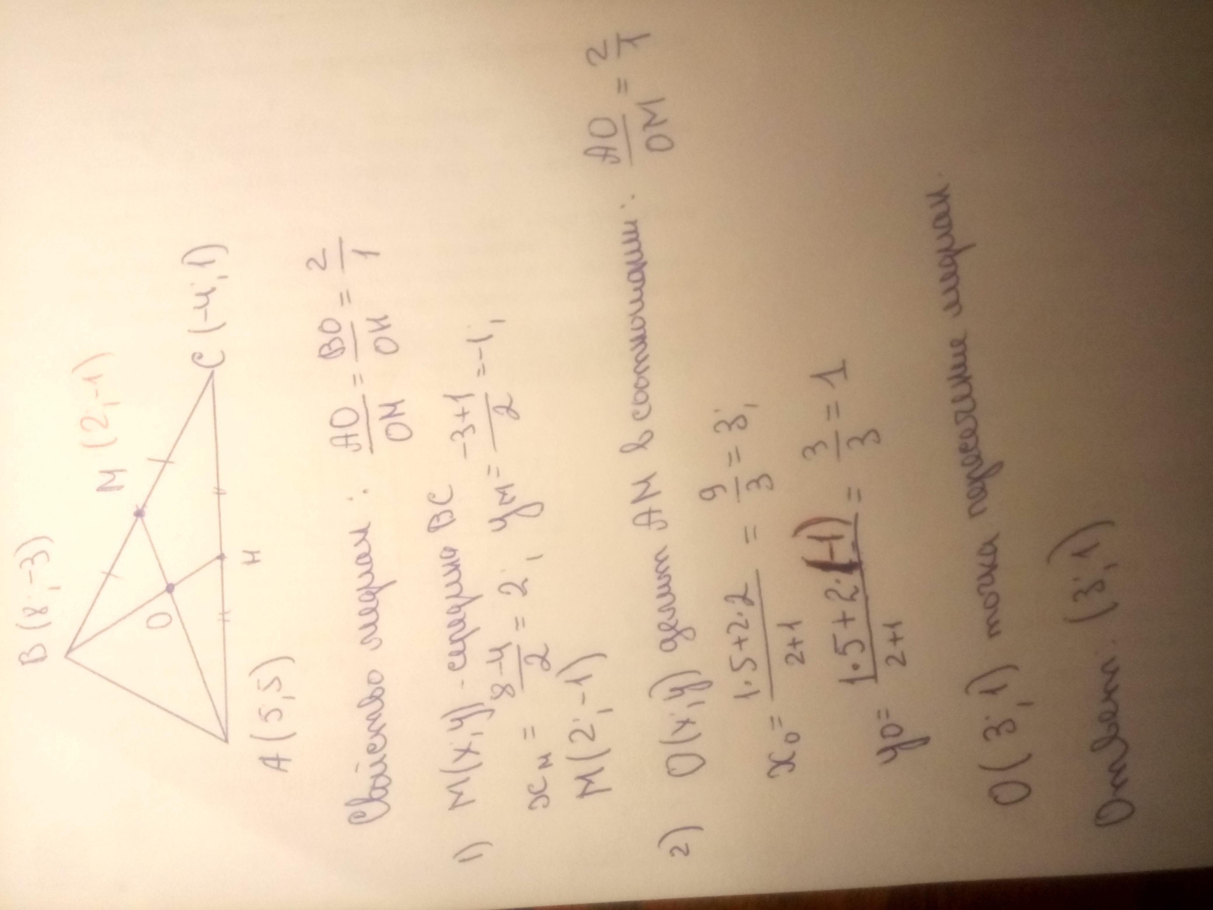 34 балла срочно! Треугольник АВС задан координатами вершин А(5;5) В(8;-3)С(-4;1).Найти координату точки пересечения медиан треугольника.