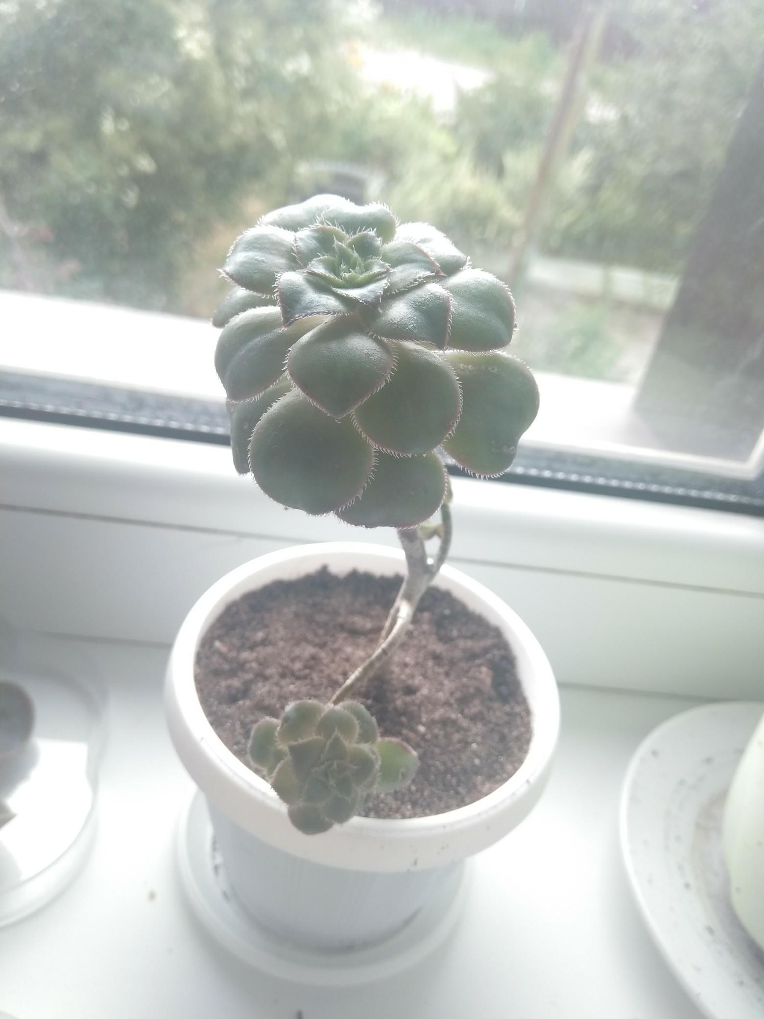 Эониум - суккулент, у которого много сортов и гибридов, из семейства толстянковых. Поэтому его путают с эхеверией: оба цветка называют "каменной розой". Уход и размножение подобны. Но старые эониумы надо обновлять черенкованием, так как в природа это кустарник. На фотографии видно, что стебель одревесневший. Эониумы, к тому же, очень часто (Ваш, как раз) имеют ворсинки (зубчики, реснички) по краям, а у эхеверии их нет, ее листья гладкие, только шип в конце листа. И листики у эониумов не такие толстые и сочные, как у эхеверий.