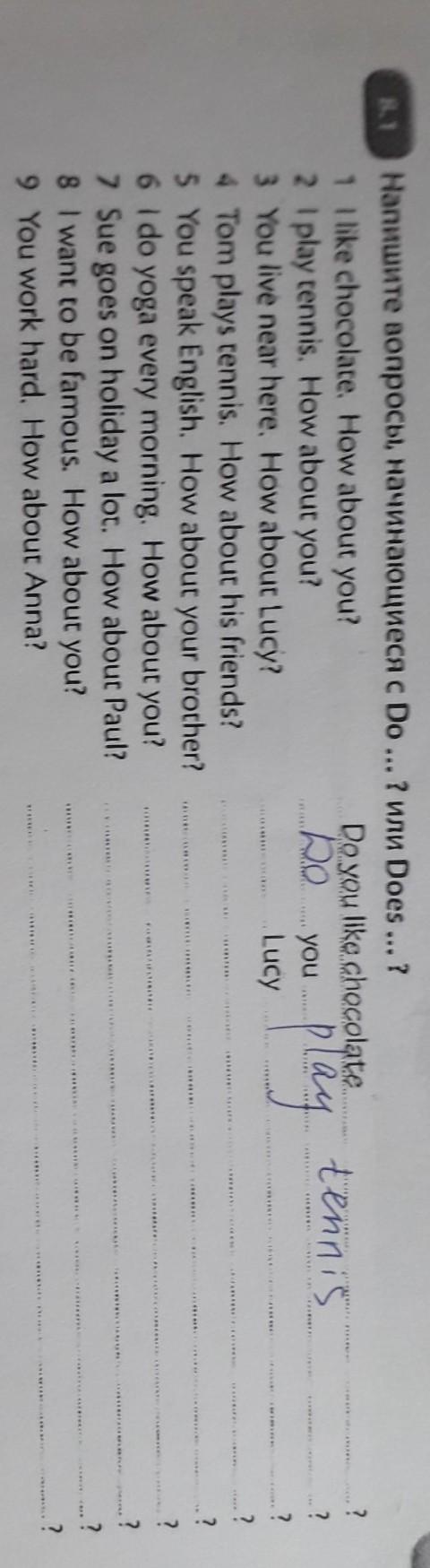 Ответ:3Does Lucy live near here?4Does Tom play the tennis?5Does your brother speak english?6Do you yoga every morning?7Does Sue goes on holiday a lot?8Do you want to be famous?