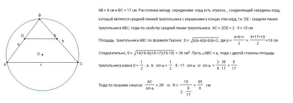 Помогите!! Из одной точки окружности проведены две хорды длиной 9 и 17 см. Найдите радиус окружности, если расстояние между серединами данных хорд равно 5 см.