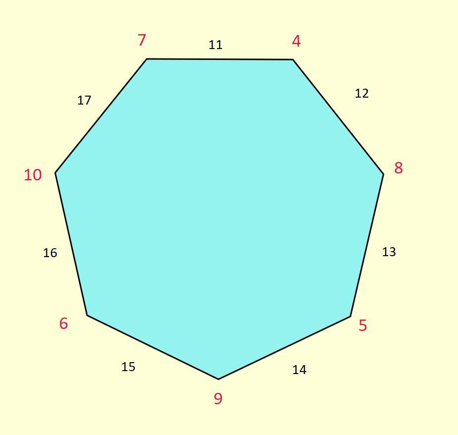 В вершинах 7-угольника записаны натуральные числа. На каждой стороне, соединяющей 2 вершины, записали сумму двух соответствующих чисел. Может ли быть на сторонах записана следующая последовательность чисел 11, 12, 13, 14, 15, 16, 17?