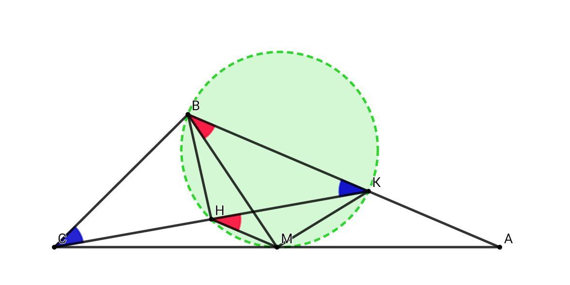 ∠КВМ = ∠КНМ = α - углы, опирающиеся на общую дугу МК