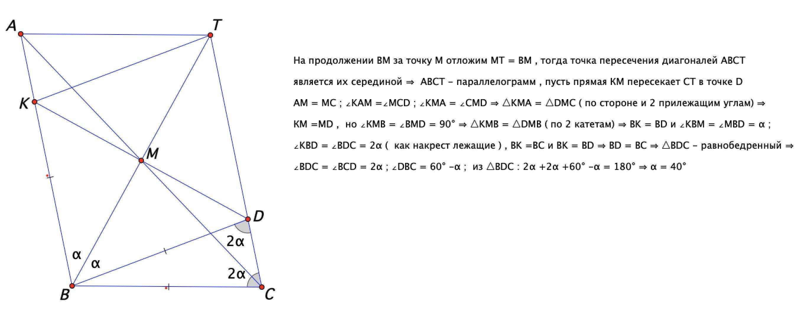 В ΔВСК: α + α + (60° + α) = 180° ⇒ α = 40°