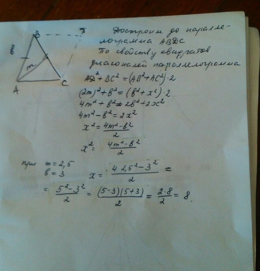 Бічна сторона рівнобедреного трикутника дорівнює b, медіана, яка проведена до бічної сторони, дорівнює m. Визначити квадрат основи трикутника й обчислити його значення, якщо m=2.5; b=3.