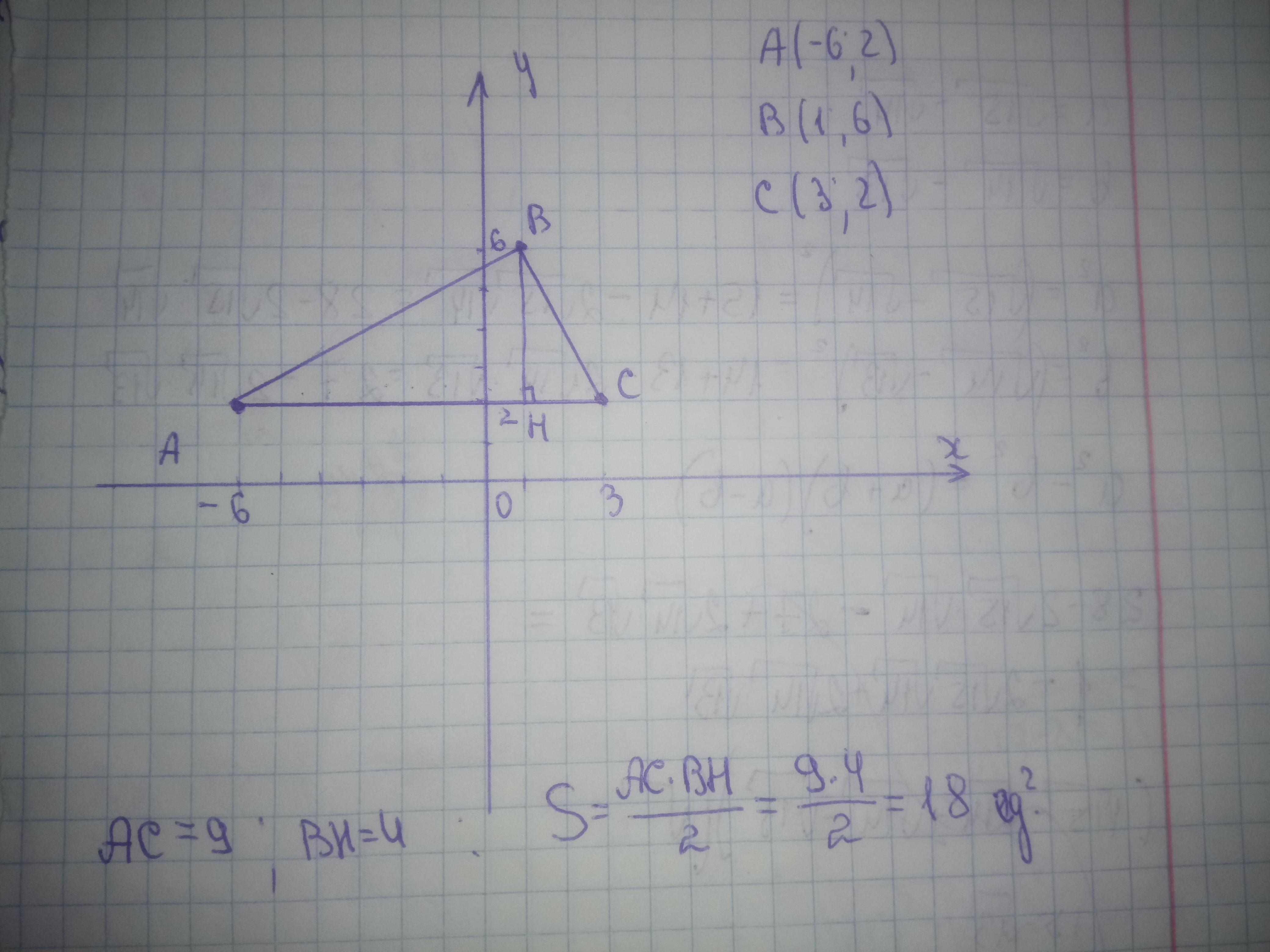 Найдите площадь треугольника с вершинами А(-6 ; 2), В(1 ; 6), С(3 ; 2).