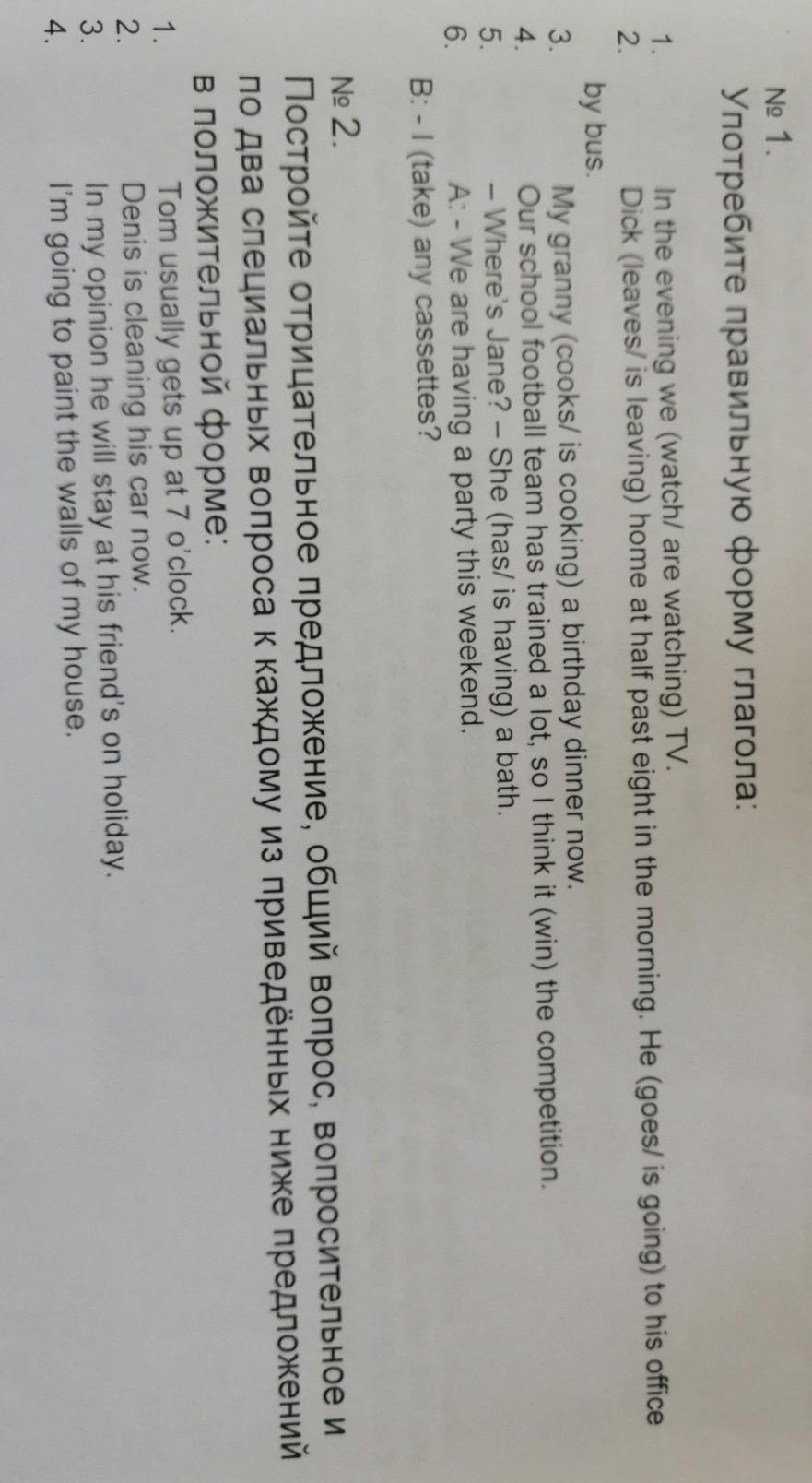 1. In the evening we watch TV. Dick leaves home at half past eight in the morning. He goes to his office by bus. My granny is cooking a birthday dinner now. Our school football team has trained a lot, so I think it will win the competition. Where's Jane? - She is having a bath. We are having a party this weekend. - Shall I take the cassettes?