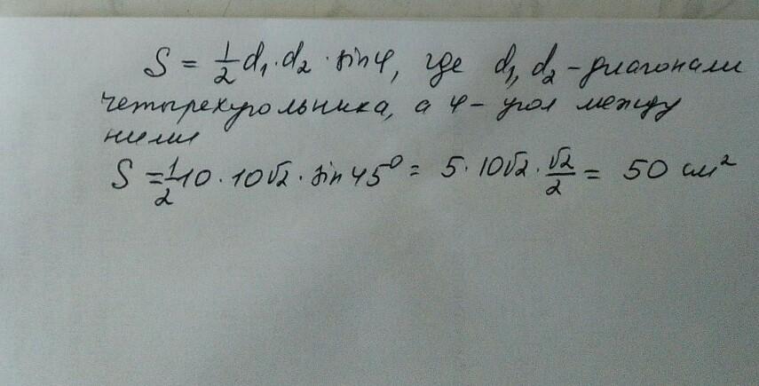 Знайдіть площу трапеції, якщо її діагоналі дорівнюють 10см і 10√2 см, а кут між ними становить 45°