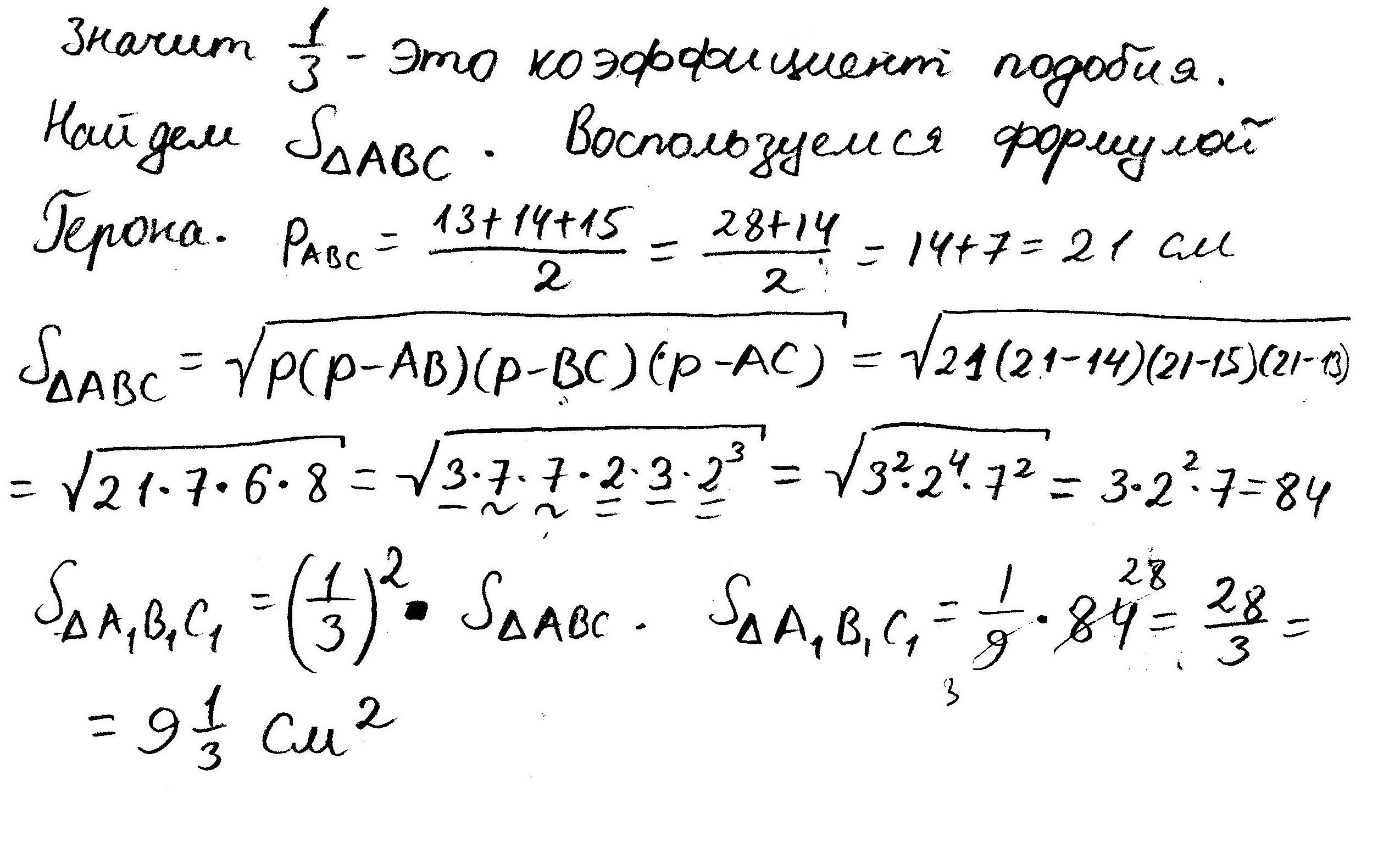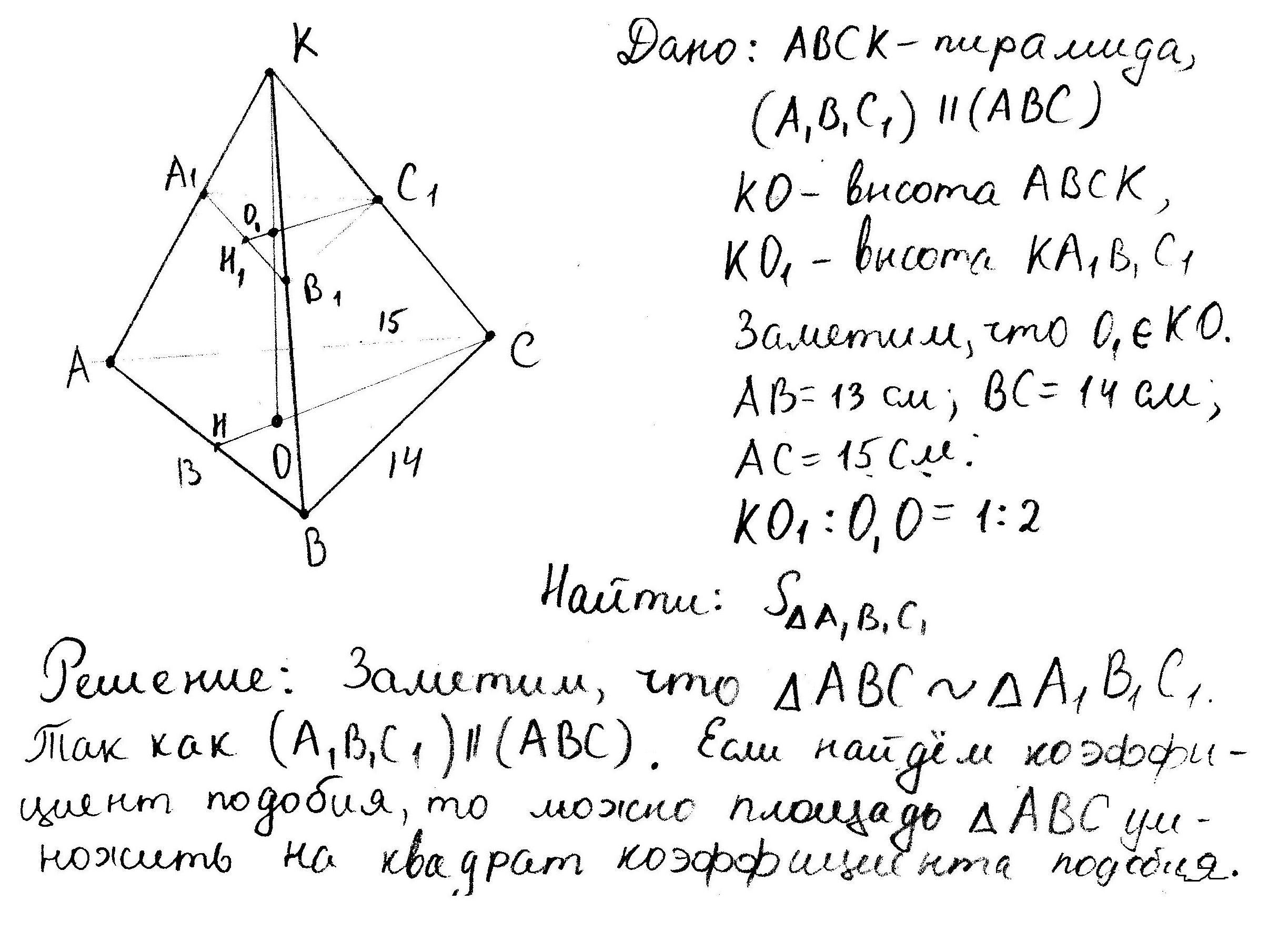 основою піраміди трикутник зі сторнами 13см 14 см 15 см знайти площу перерізу який проходить паралельно площині основи і ділить висоту піраміди у відмножені 1:2 рахуючи від вершини
