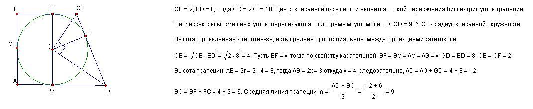 В прямоугольную трапецию вписана окружность, точка касания с которой делит большую боковую сторону трапеции на отрезки длинами 2 и 8. Найдите длину средней линии трапеции.