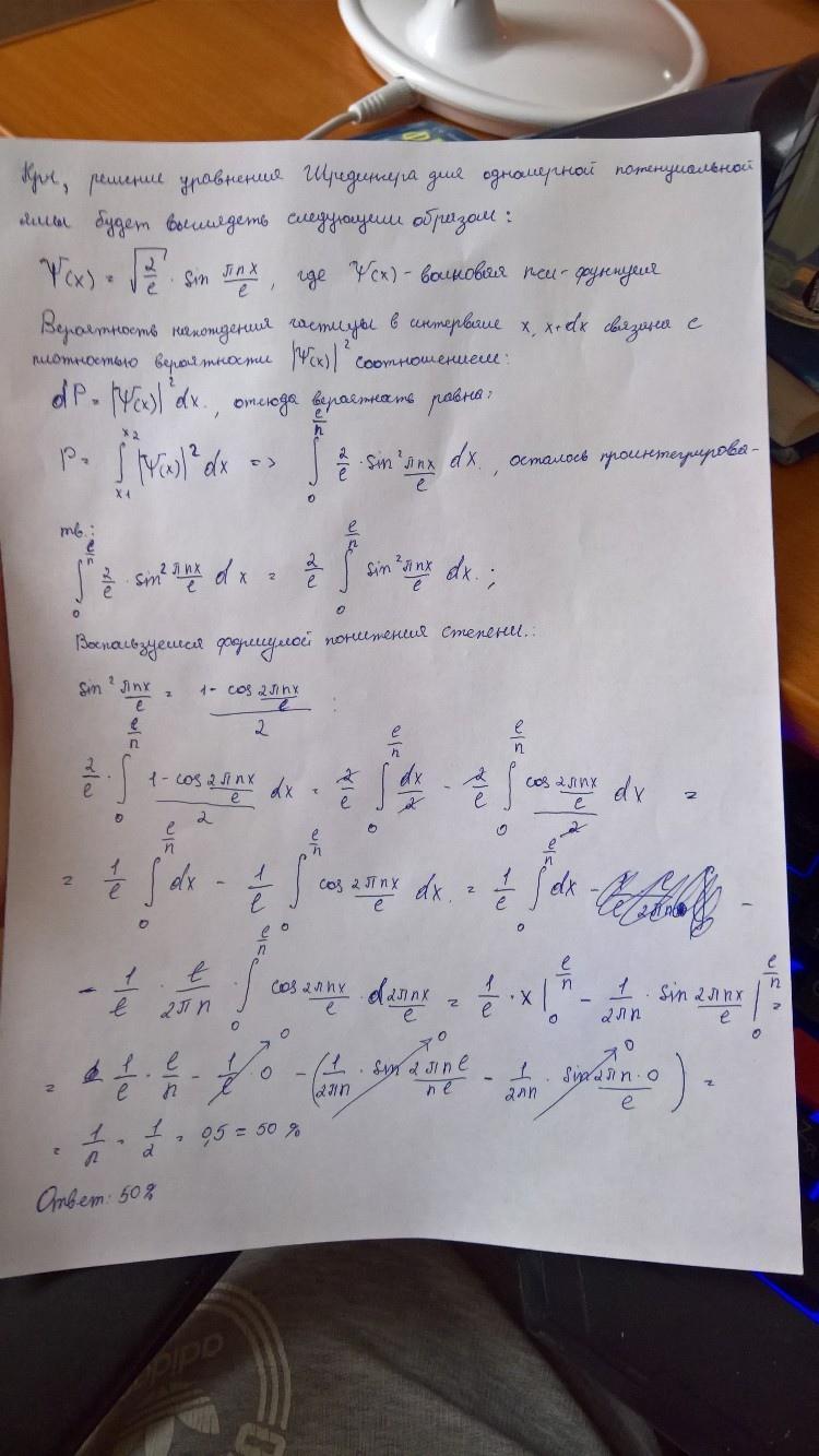 Электрон находится в одномерной глубокой потенциальной яме в возбуждённом состоянии. На ширине l ямы укладывается n=2 полуволн де Бройля. Определите вероятность нахождения электрона в интервале l/n ямы.