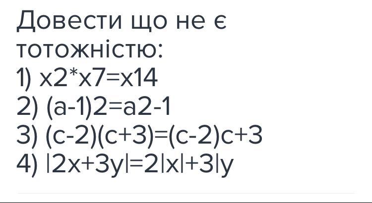 Тотожність - це рівність, яка виконується на всій множині значень змінної. Тобто, рівність, яка виконується для будь-яких значень змінної. І, щоб довести, що рівність не є тотожністю, треба підібрати таке значення змінної, при якій рівність не буде виконуватись.